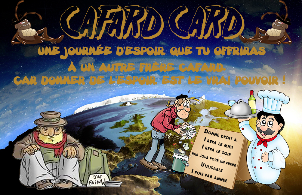 Une journée d’espoir que tu donneras à un autre frère Cafard. Car donner de l’espoir est le vrai pouvoir !!!! Fonctionnement de la Cafard Card : Elle donne droit à un repas midi et soir dans la même journée. Elle est conservée par le client, afin qu’il la transmette ä une autre personne étant dans le besoin Lire plus ...